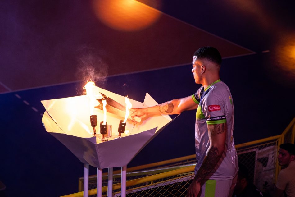 A entrada do fogo simbólico, que representa a união, a amizade e o espírito de paz durante a competição, ficou por conta do atleta luverdense Saymon Feitosa.