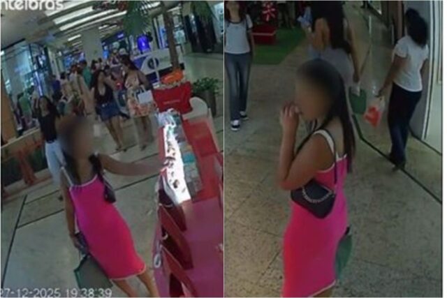 Imagens de câmeras de videomonitoramento registraram o momento em que uma mulher, ainda não identificada, furtou um perfume de um quiosque no Pantanal Shopping, na noite de sábado (27).