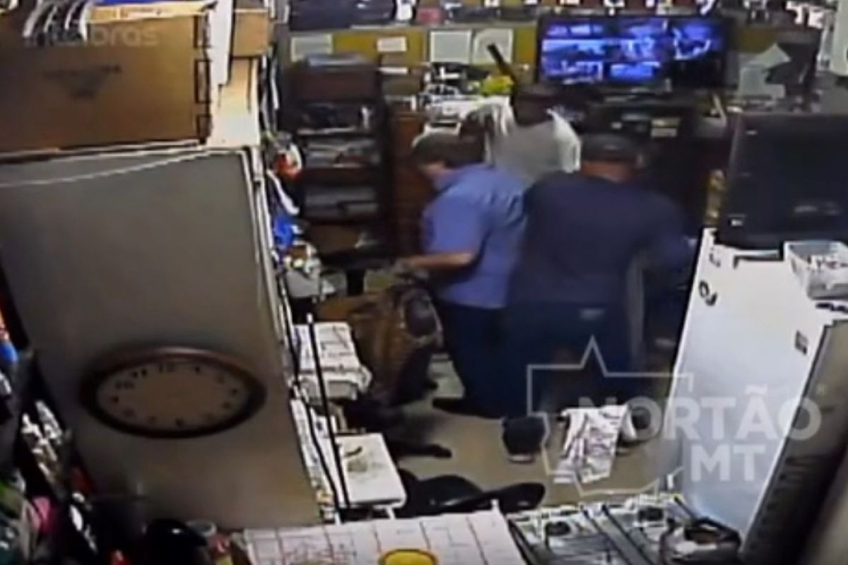 Em outro ângulo das câmeras, os bandidos rendem o dono da relojoaria. Ele tenta reagir com uma arma, mas é dominado e agredido com coronhadas na cabeça. Os assaltantes tomam a arma e recolhem diversas joias, incluindo mostruários completos da loja.