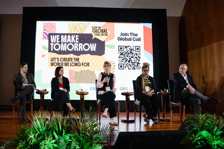 Com uma visão focada no ativismo global e na mobilização da sociedade civil, Alison Tickell, fundadora da organização britânica Julie’s Bicycle e líder da campanha global We Make Tomorrow, defendeu que a crise climática é, em sua essência, um desafio cultural. Ela argumentou que a liderança para posicionar a cultura no centro do debate não partiu de governos, mas da própria comunidade artística, de ativistas e, fundamentalmente, dos povos indígenas. “A cultura é inseparável do conhecimento ancestral e tradicional, das diversas línguas, práticas, crenças e do rico patrimônio dos povos indígenas”, afirmou Tickell, destacando que são esses os setores que detêm a resiliência e a memória necessárias para as soluções climáticas.