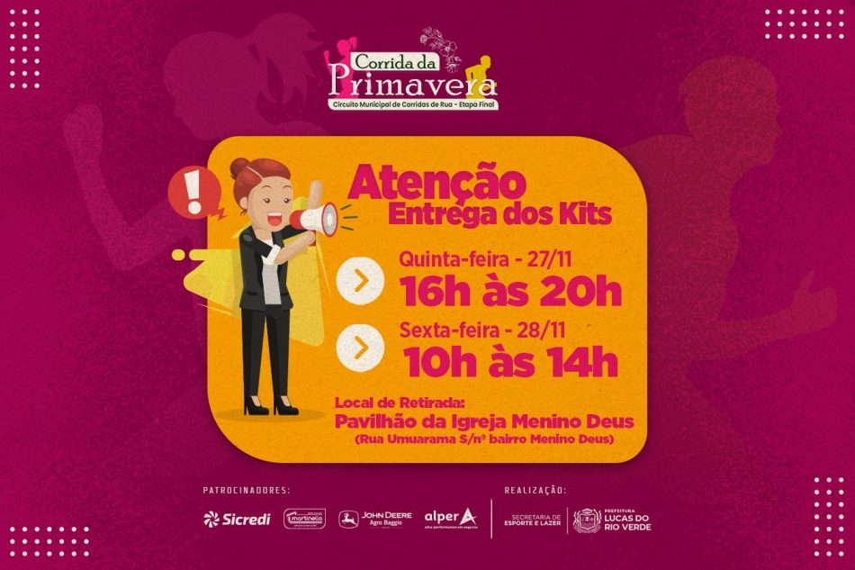 A entrega dos kits contendo numeral de peito, chip e camiseta acontecerá na quinta-feira (27), das 16h às 20h e na sexta-feira (28), das 10h às 14h, no Pavilhão da Igreja Menino Deus, localizado na Rua Umuarama, S/N, bairro Menino Deus.