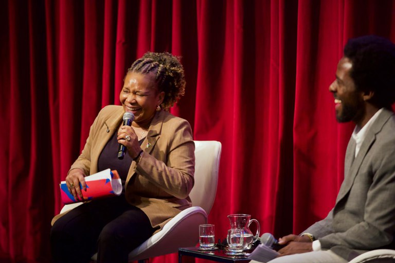 A ministra da Cultura, Margareth Menezes, participou de um bate-papo, conduzido pelo ator Alan Rocha, para encerrar as atividades do primeiro dia do 1º Seminário Nacional de Ações Afirmativas na Cultura: Política Nacional Aldir Blanc em Todo Canto do Brasil, realizado nesta terça-feira (7), no Sesc Bom Retiro, em São Paulo.