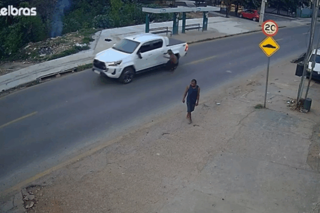 Imagens de uma câmera de segurança mostram o momento em que um morador de rua é atropelado por uma caminhonete Hilux após tentar atravessar a rua, no Bairro Despraiado, em Cuiabá, no último domingo (16).