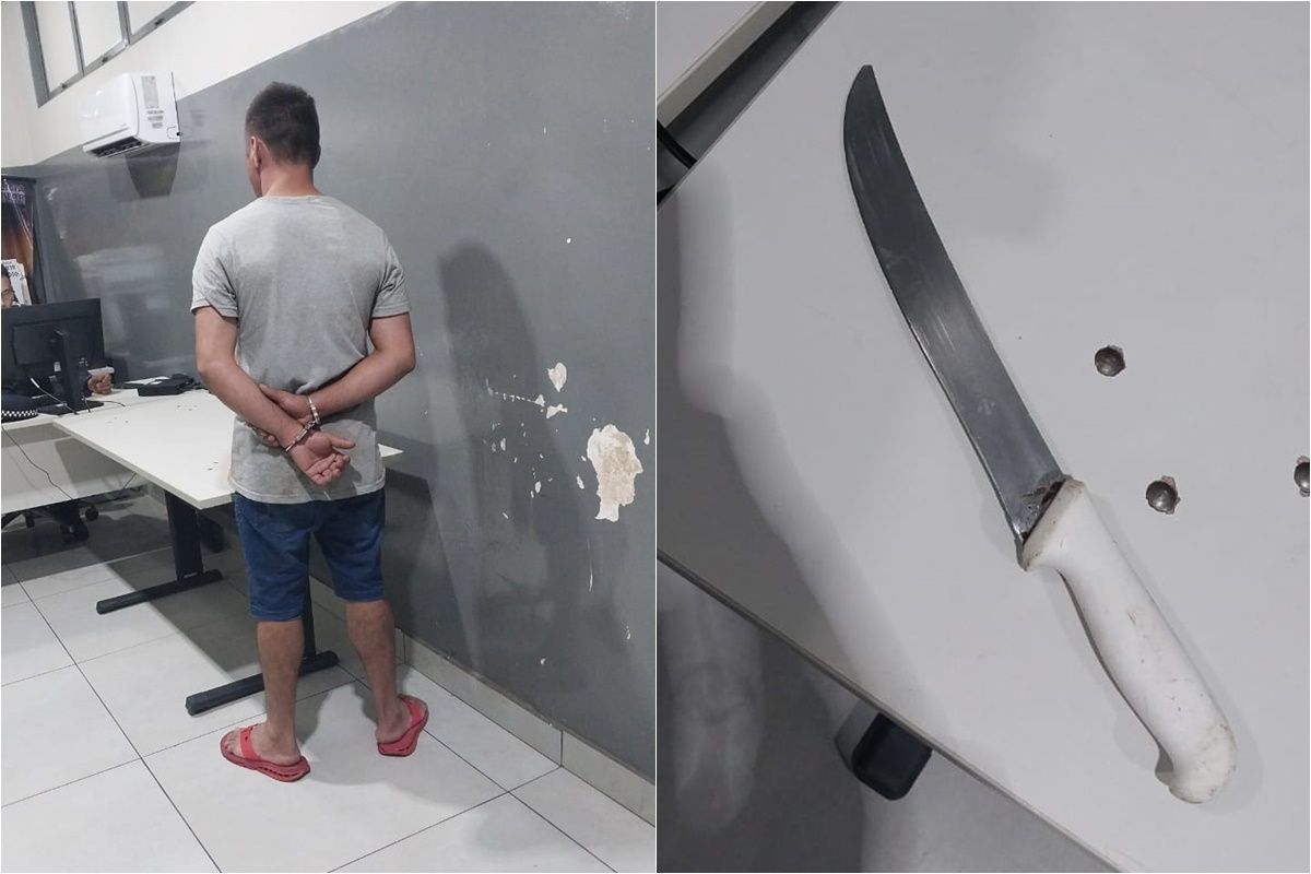 A Guarda foi até o local e encontrou o suspeito tentando invadir a residência. Ele já havia desferido três golpes de faca na porta e arrombado. Valdener estava descumprindo uma medida protetiva contra a vítima.